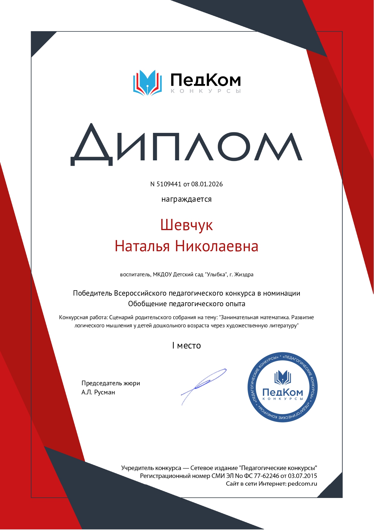 Диплом 1 место Победитель Всероссийского педагогического конкурса