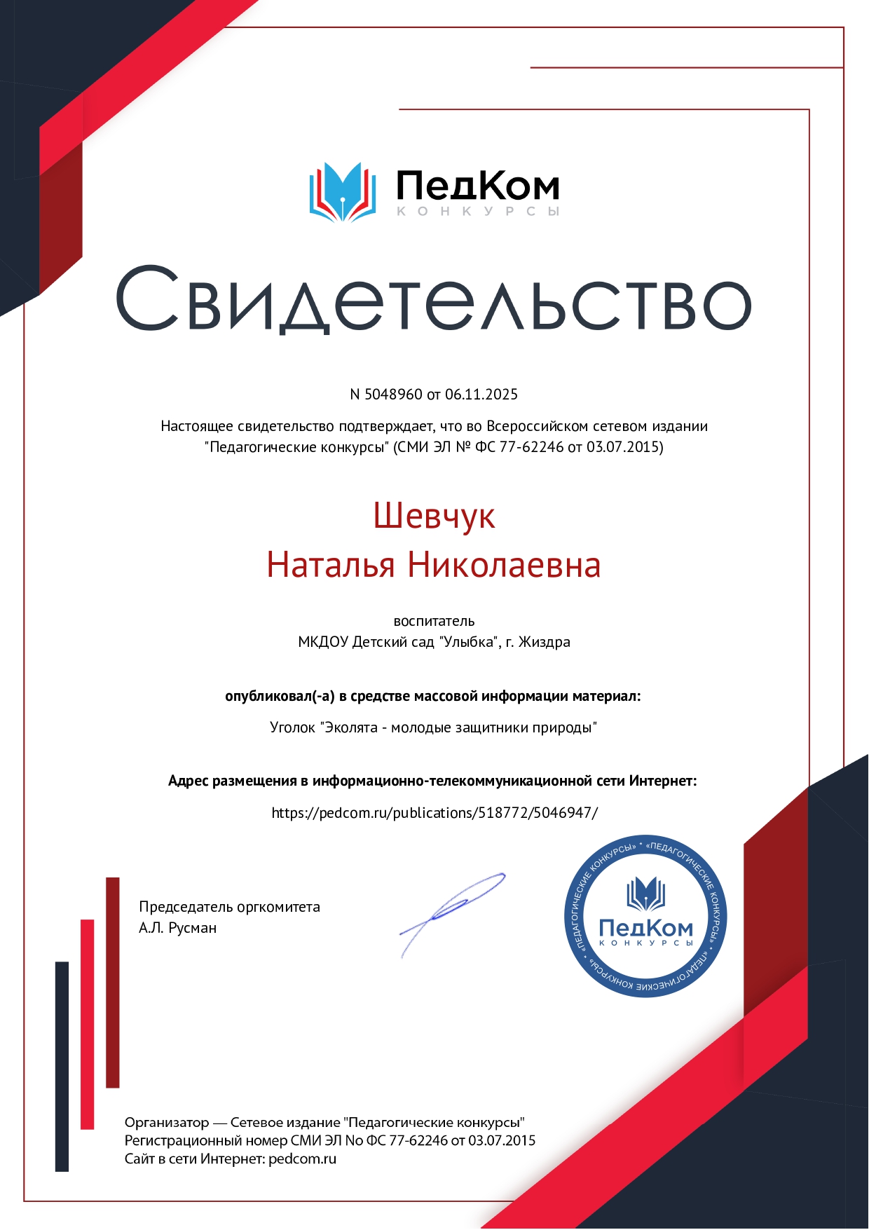 Свидетельство о публикации в Всероссийском издании "Педагогические конкурсы"