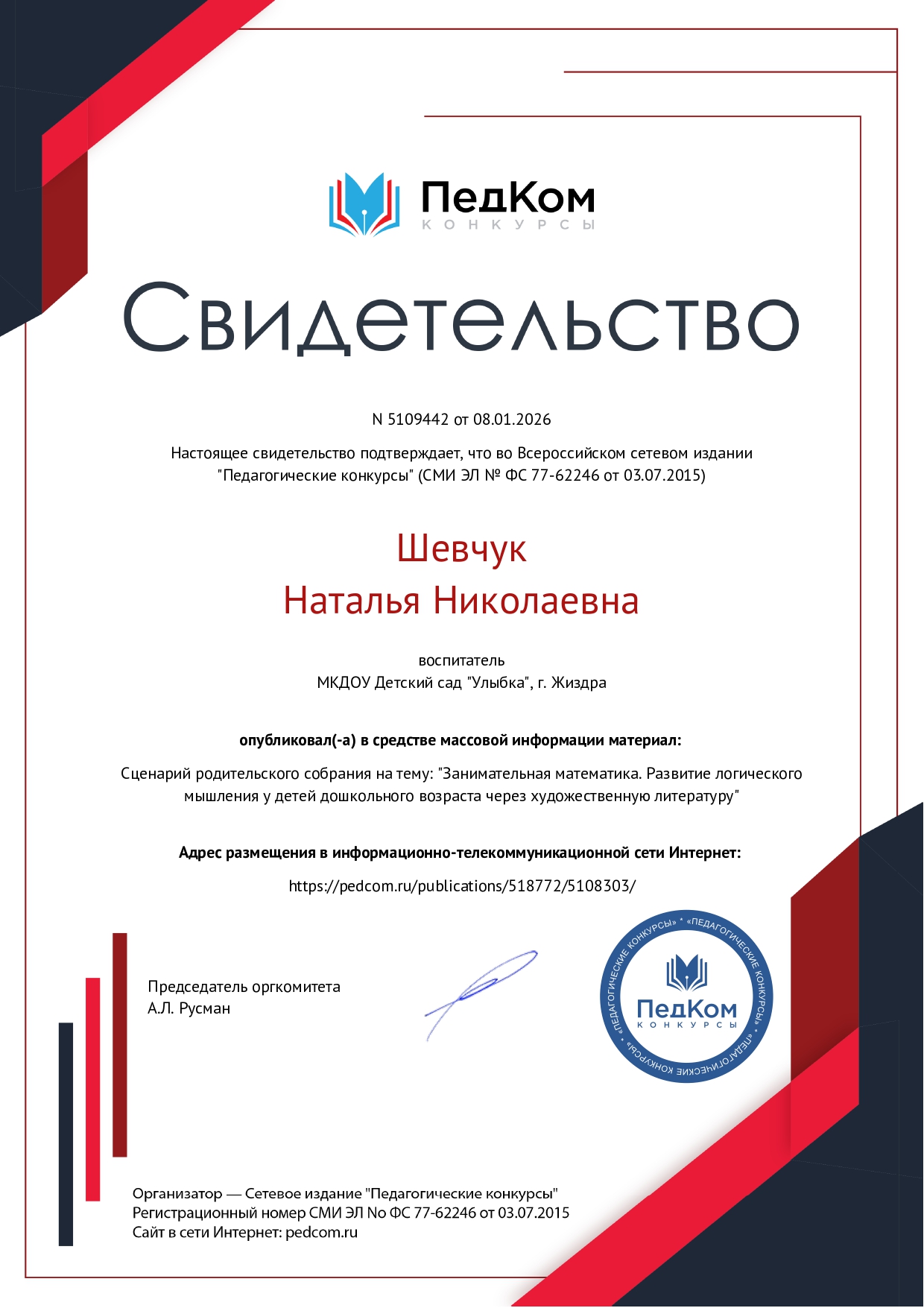 Свидетельство о публикации в Всероссийском сетевом издании "Педагогический конкурсы"